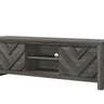 This bedroom collection encapsulates a blend of contemporary design and rustic charm. The centerpiece, a bed with a distinguished chevron patterned headboard, evokes a sense of craftsmanship and texture, infusing the space with character. Flanking the bed are matching pieces, each exhibiting clean lines and a finish that suggests a lived-in elegance. The dresser, complemented by a substantial mirror, along with the tall chest, offer ample storage solutions with understated metal handles that enhance the modern farmhouse aesthetic. A nightstand completes the set, its compact design making it a practical addition to the suite.