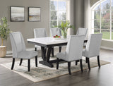 A fresh take on a traditional silhouette makes this group a great addition to your dining space. A faux marble top provides an elegant look while being easy to care for. The trestle base is updated in a contemporary charcoal finish. The upholstered dining chairs feature gently sloped wings and a nail head trim on the back. Button tufting accents the dining bench.