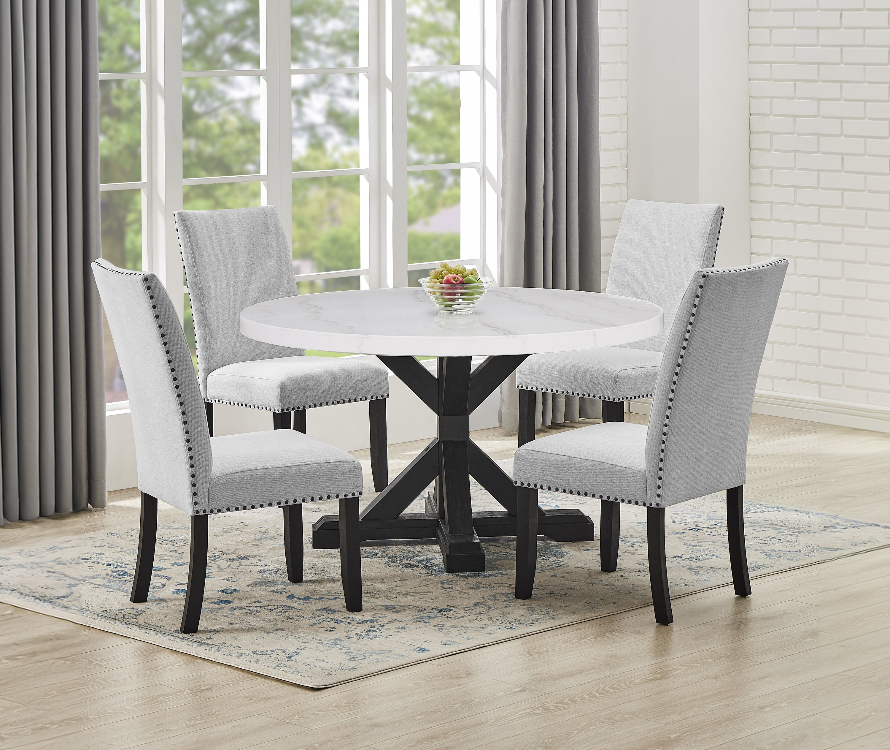 A fresh take on a traditional silhouette makes this group a great addition to your dining space. A genuine marble top is luxurious and timeless. The trestle base is updated in a contemporary charcoal finish. The upholstered dining chairs feature nail head trim. Button tufting accents the dining bench.
