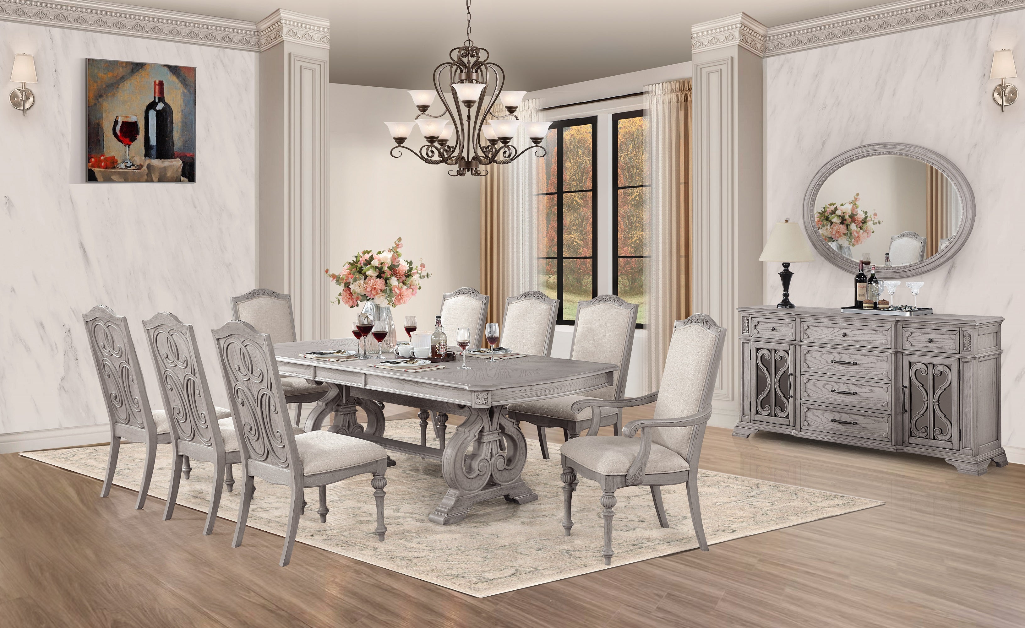 Traditional French-country styling with ornate scrollwork and a weathered dark-gray finish. Chairs are upholstered in a light beige fabric.