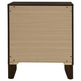 Introduce a sense of richness and depth to your bedside with a modern two-drawer nightstand. Crafted in durable laminate with a walnut finish, it lends warmth and stylish flair. A pair of drawers create ample space for bedside essentials, everything from personal items and charging cables to books. The front of the case features mitered trim, while tapered block legs add lightness to its presentation. Petite gold finish round knobs add a touch of contrast and elegance, perfect for a refined bedroom.