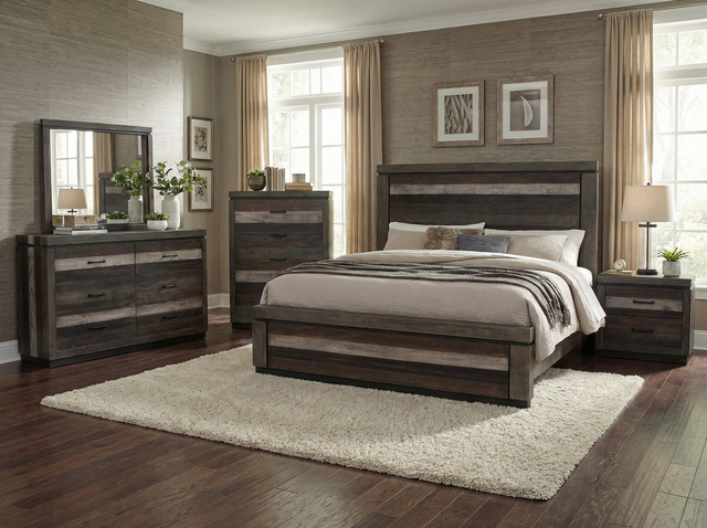 Give your primary suite a grounded, rustic look with this coordinated 6-piece bedroom collection. The statement panel bed features broad horizontal planks framed by clean lines for a substantial silhouette. A multi-tone finish—layered ash and charcoal wood tones—adds depth and texture, while matte black bar pulls keep the look contemporary. The matching dresser and framed mirror complete your getting-ready zone, and the nightstand keeps evening essentials within reach. Built for everyday living, this set blends easily with neutral bedding, cozy knits, and industrial accents.