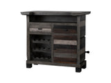 Enhance your home with this elegant bar cabinet, ideal for showcasing your wine collection. Crafted from solid wood, this exquisite server features ample storage for wine glasses, bottles, and bar essentials. Its striking combination of multicolored hues against a grey backdrop exudes exclusivity, complementing your rustic dining area with its dark wood paneling and metal accents. Complete your luxurious setup with the two matching pub chairs.