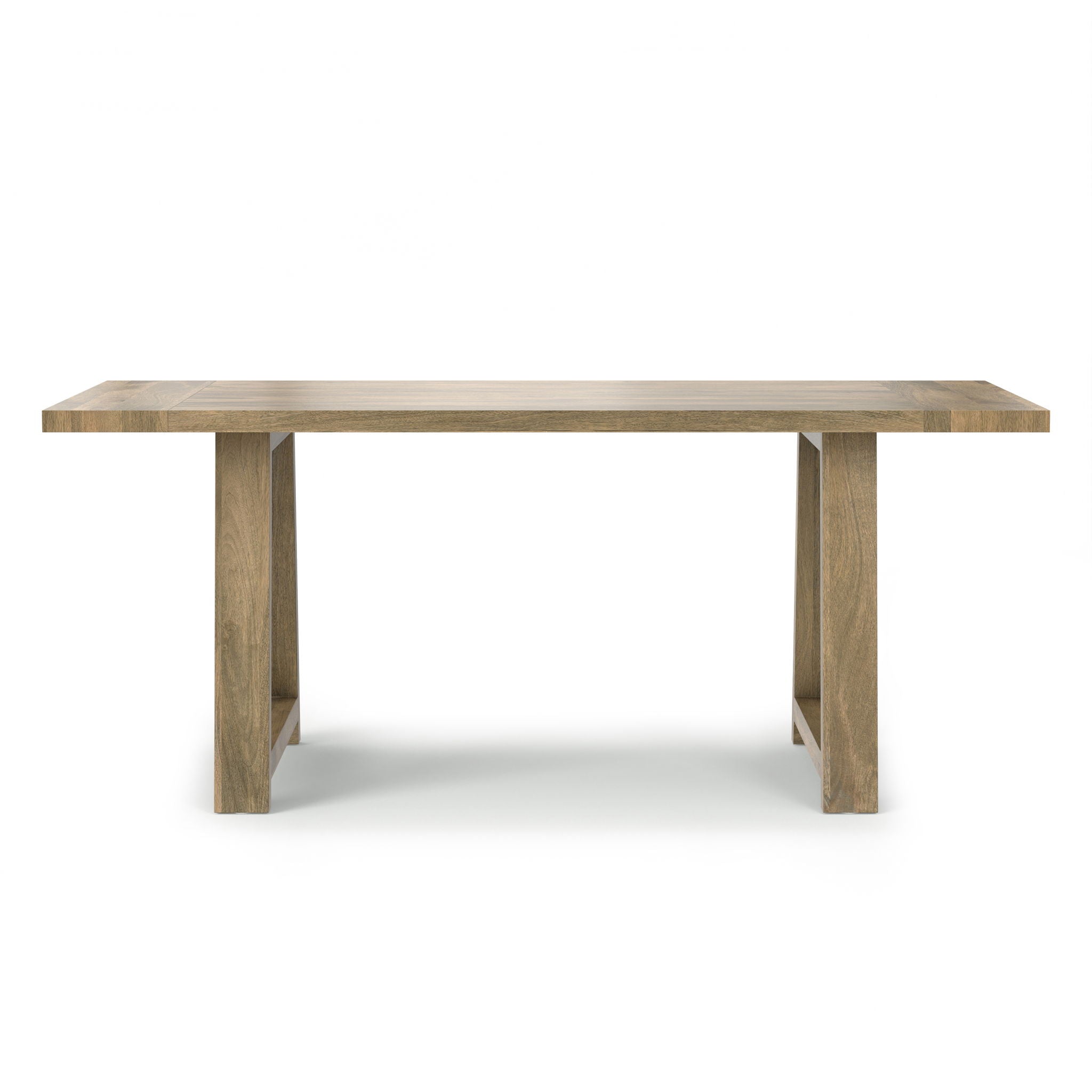 - The thick, rectangular tabletop is made with sustainably sourced solid mango wood in a Grey Wash finish and perpendicular panels on the short sides for visual contrast.